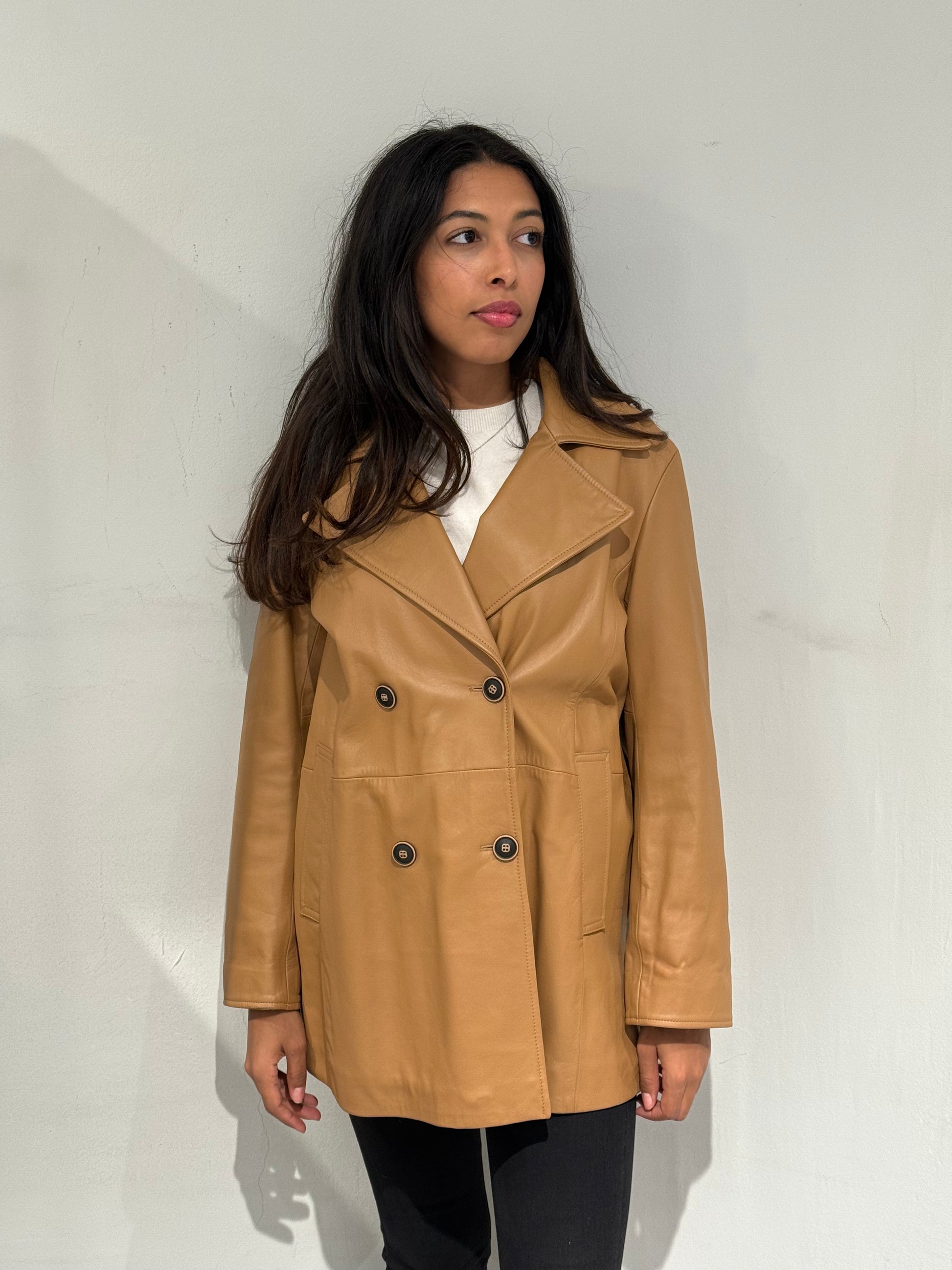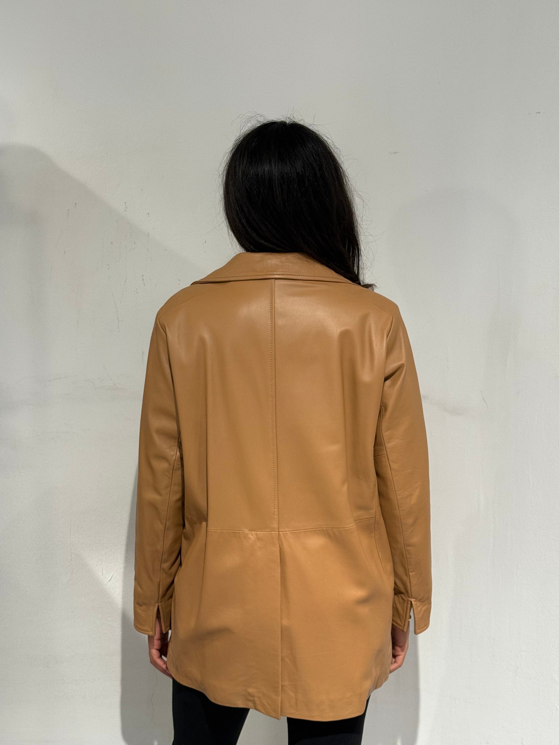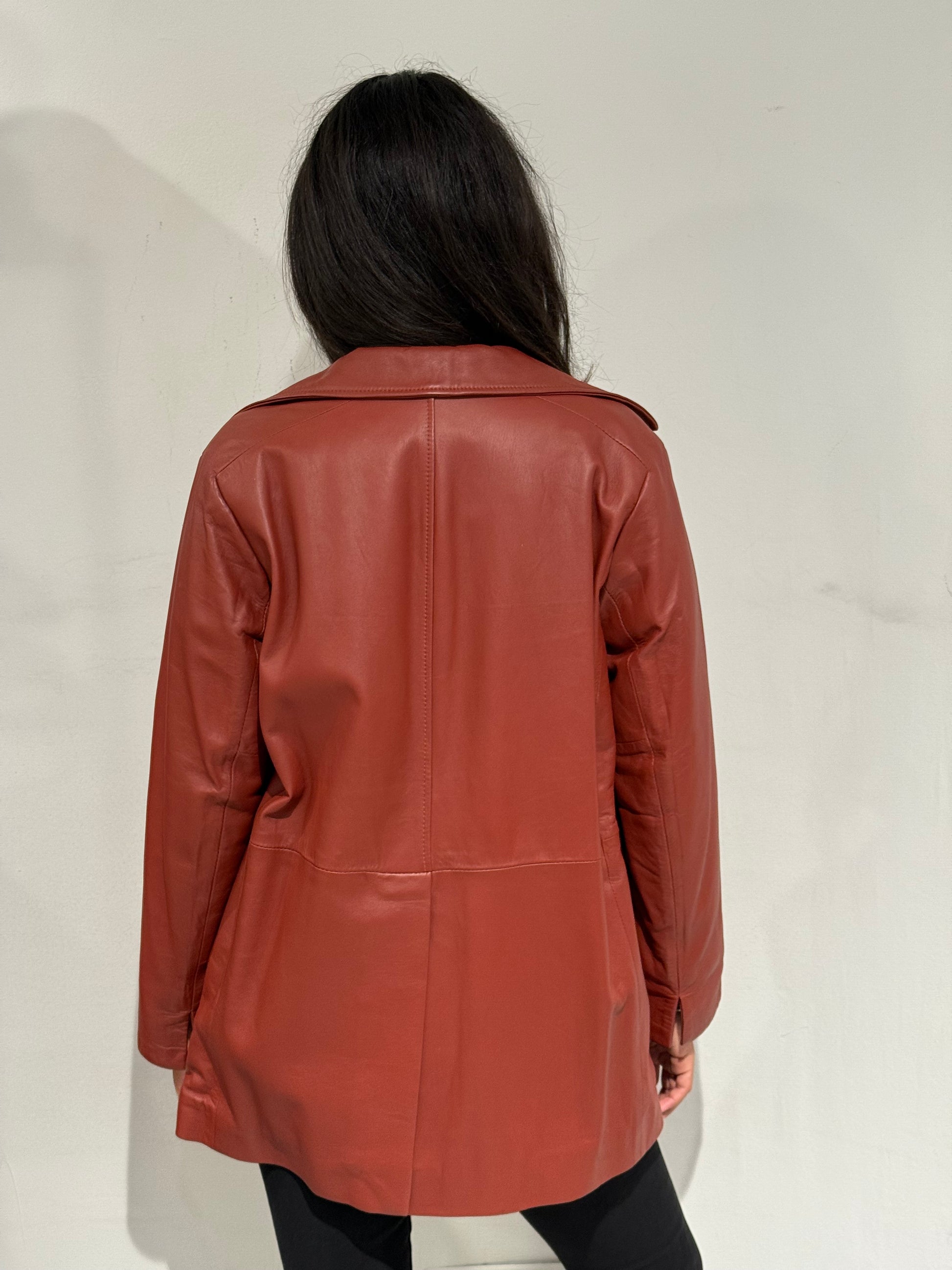 Giubbotto doppiopetto in vera pelle dal design elegante e contemporaneo. Realizzato in Italia con materiali di alta qualità, unisce la morbidezza e resistenza della pelle naturale a un taglio raffinato che valorizza la figura. Il colore caldo e la linea leggermente svasata lo rendono un capo versatile, perfetto sia per look casual che più sofisticati.
