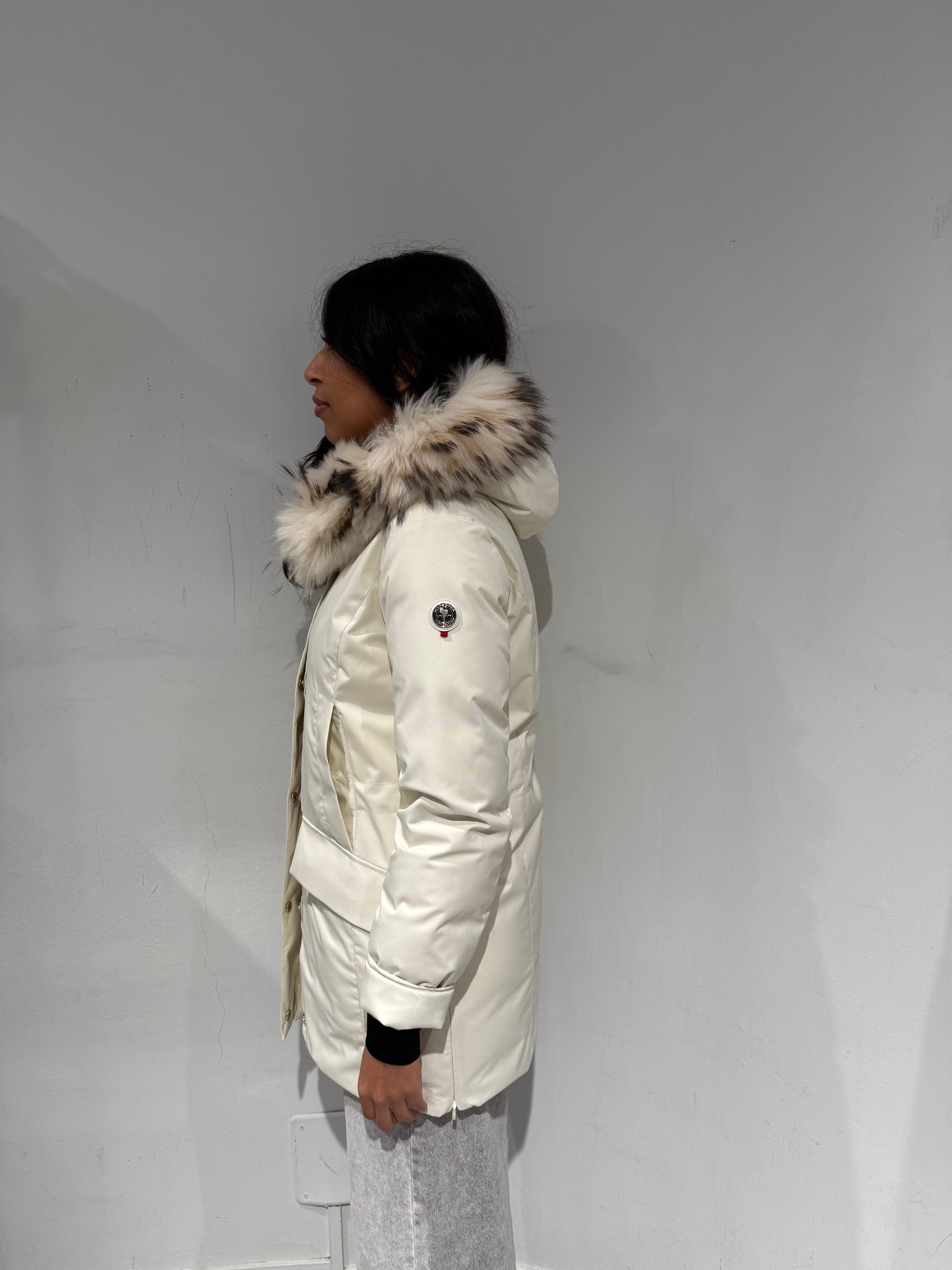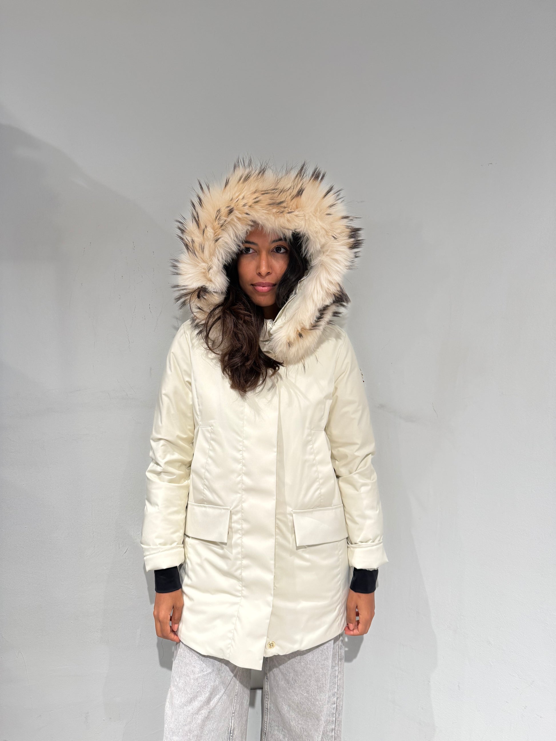 Realizzato in tessuto tecnico 100% poliestere trattato con finissaggio KX2, che assicura ottima impermeabilità (fino a 10.000 mm di colonna d’acqua), buona traspirazione (10.000 g/m² in 24h) e protezione dal vento. Cappuccio fisso con bordo in pelo Murmasky removibile.