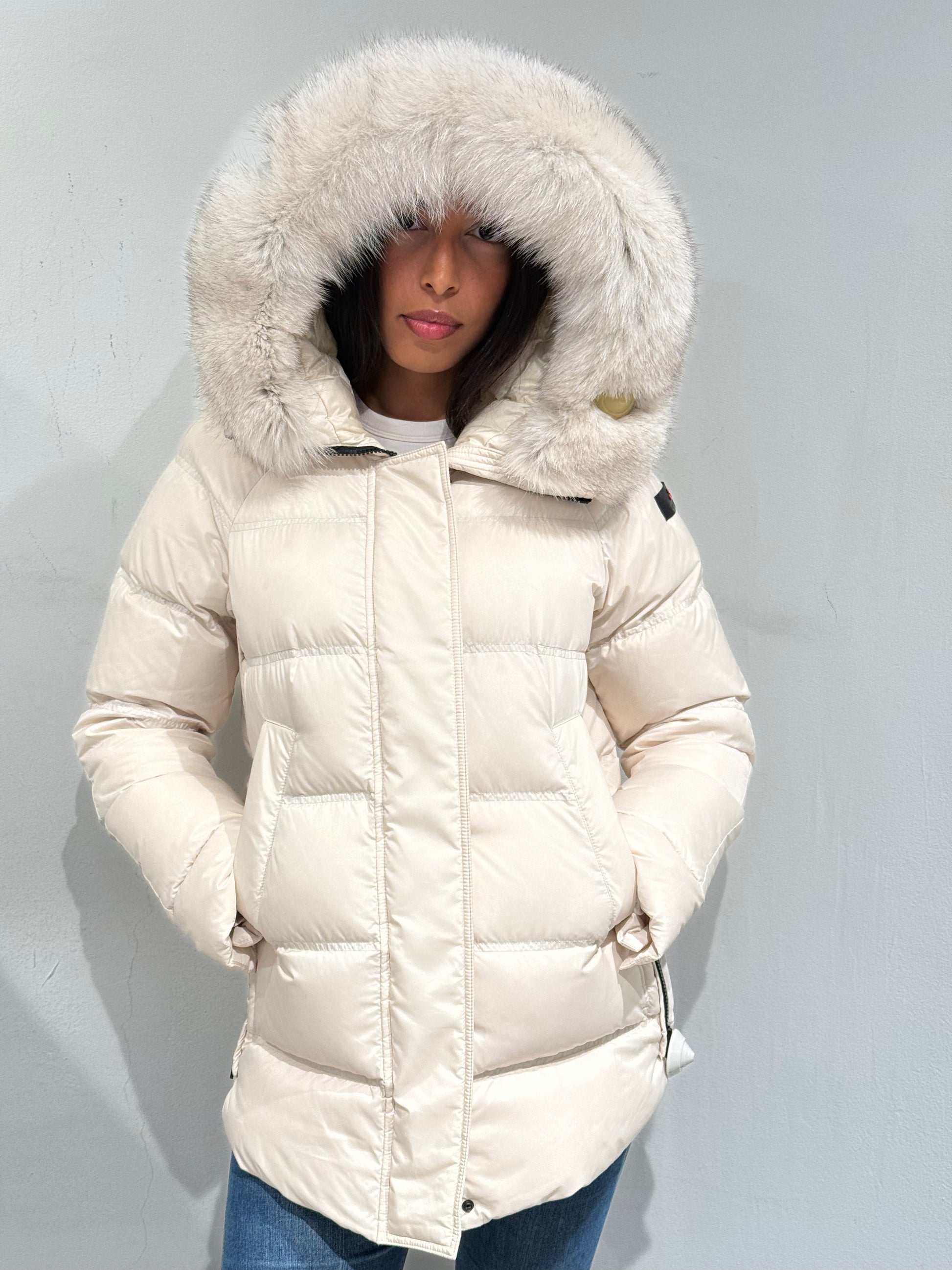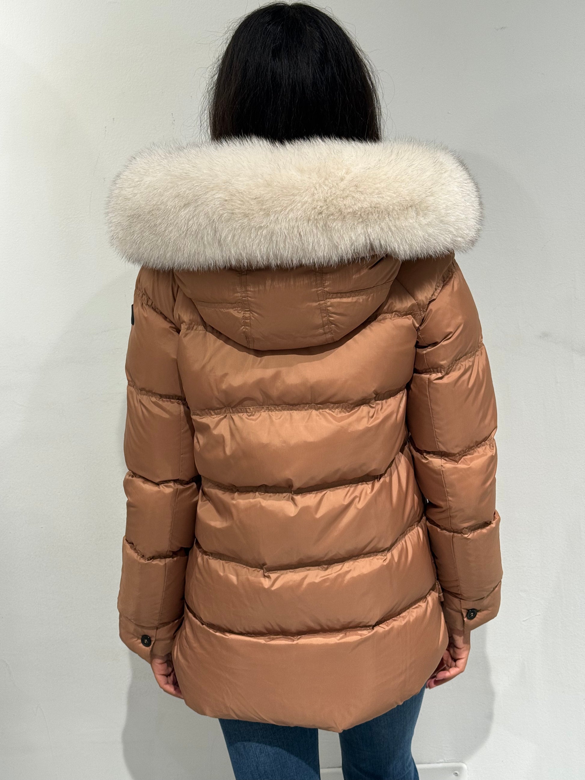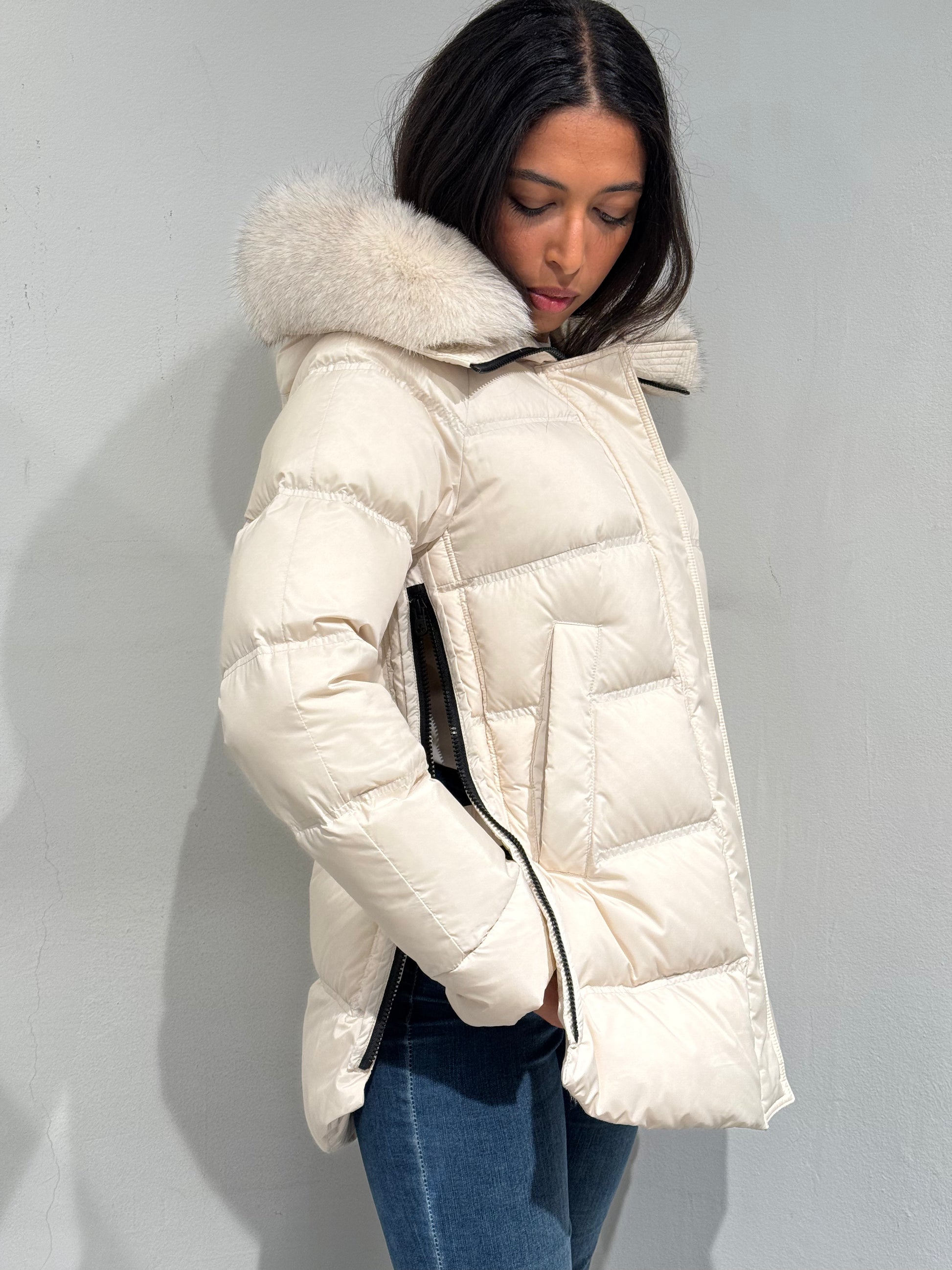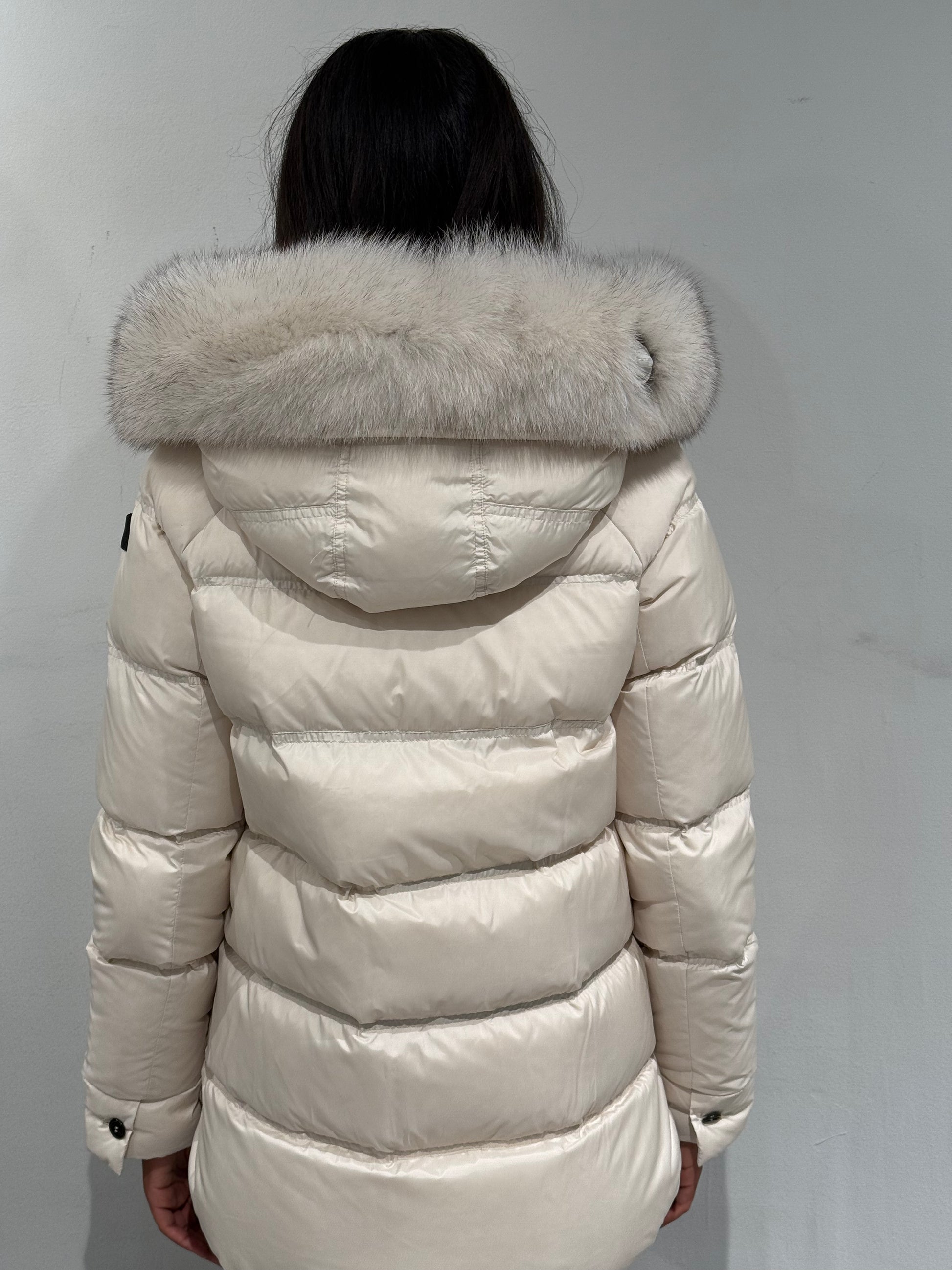 L'imbottitura in piuma naturale certificata assicur calore e comfort senza rinunciare alla leggerezza. il modello è dotto di cappuccio con bordo in pelliccia staccabile, chiusura con zip centrale coperta da patta e pratiche zip laterali per regolare la vestibilità. Un capo pratico e raffinato, pensato per accompagnarti con stile nelle giornate più fredde. Trattamento idrorepellente privo di PFC.
