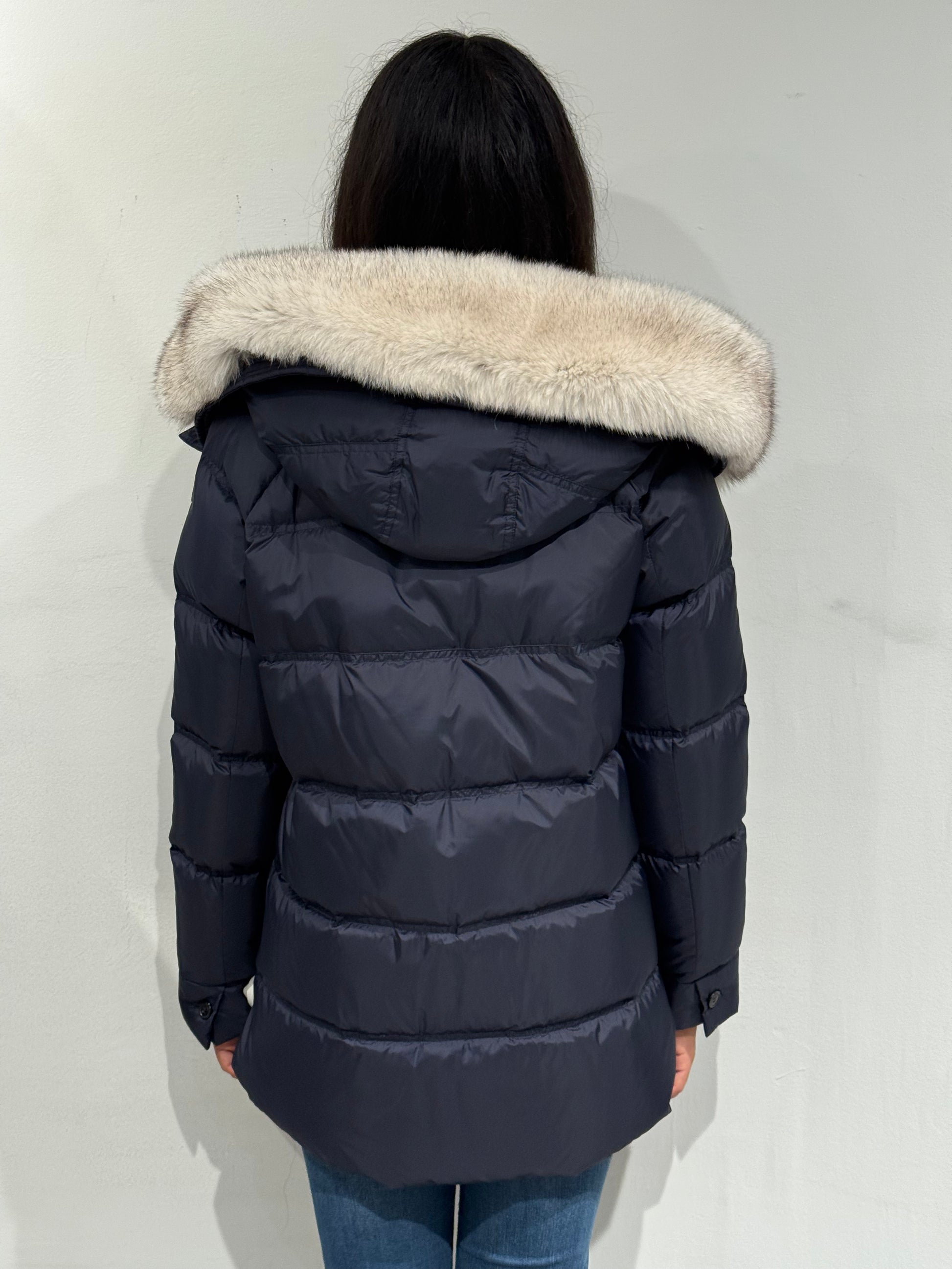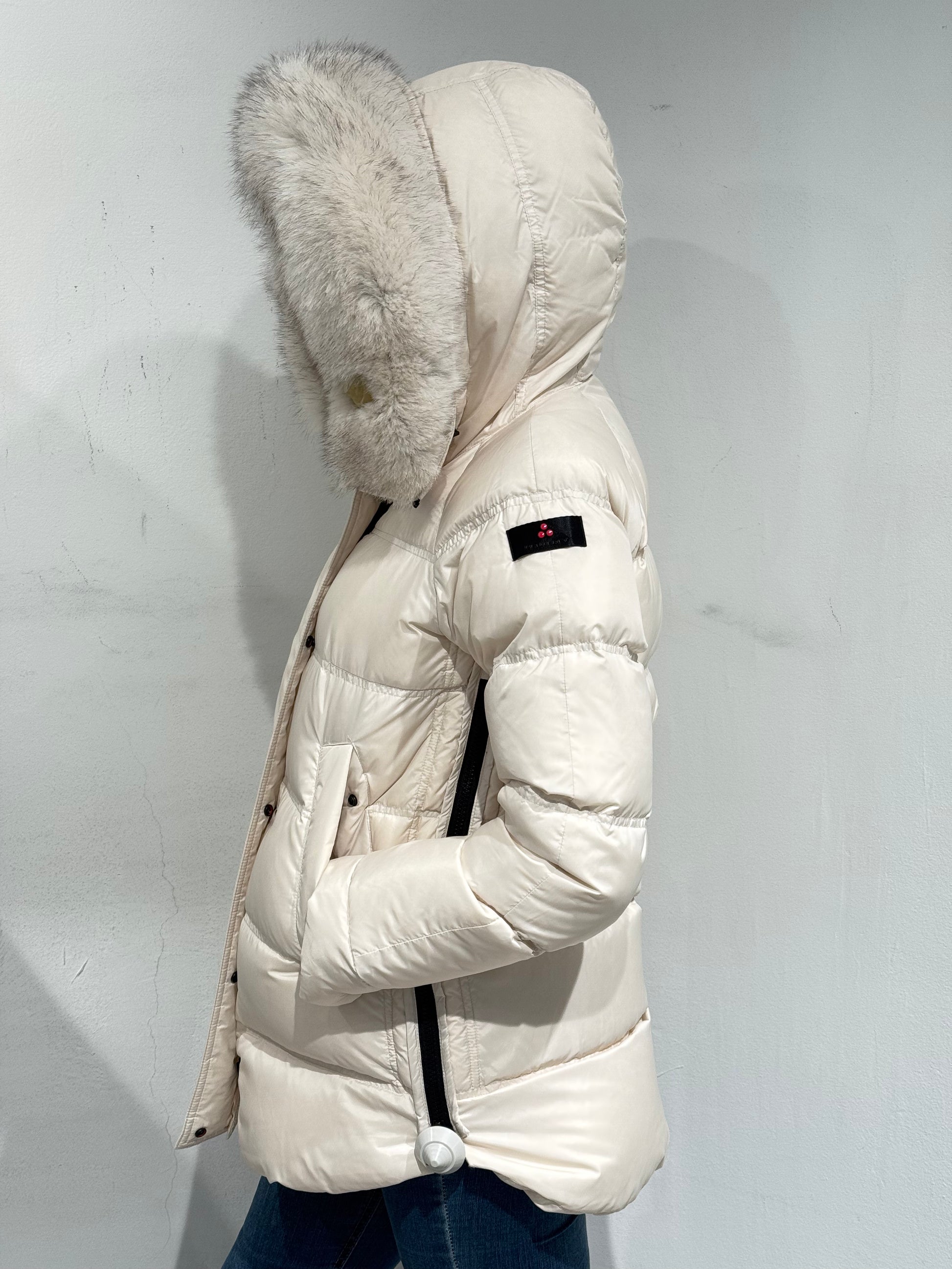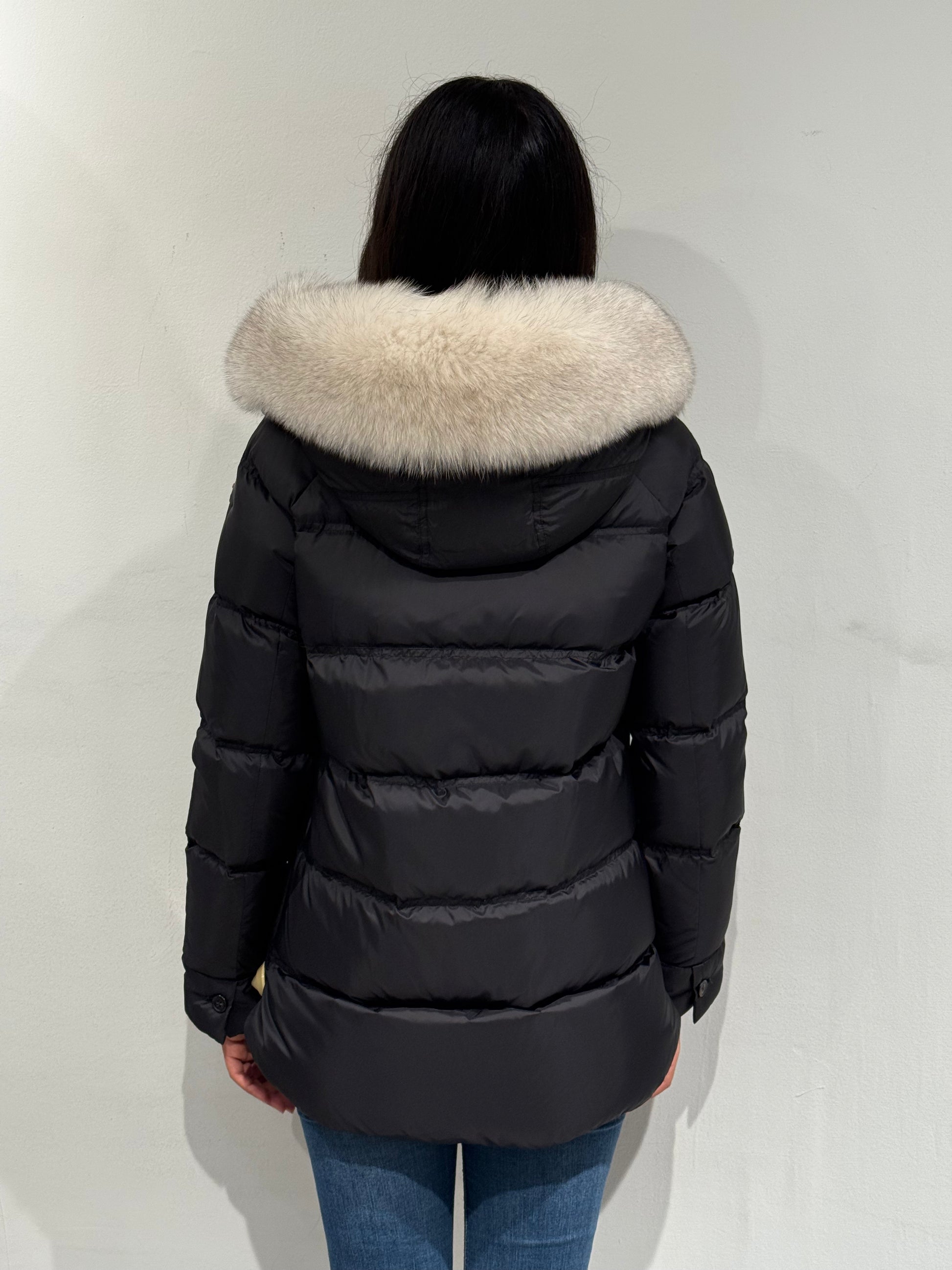 L'imbottitura in piuma naturale certificata assicur calore e comfort senza rinunciare alla leggerezza. il modello è dotto di cappuccio con bordo in pelliccia staccabile, chiusura con zip centrale coperta da patta e pratiche zip laterali per regolare la vestibilità. Un capo pratico e raffinato, pensato per accompagnarti con stile nelle giornate più fredde. Trattamento idrorepellente privo di PFC.