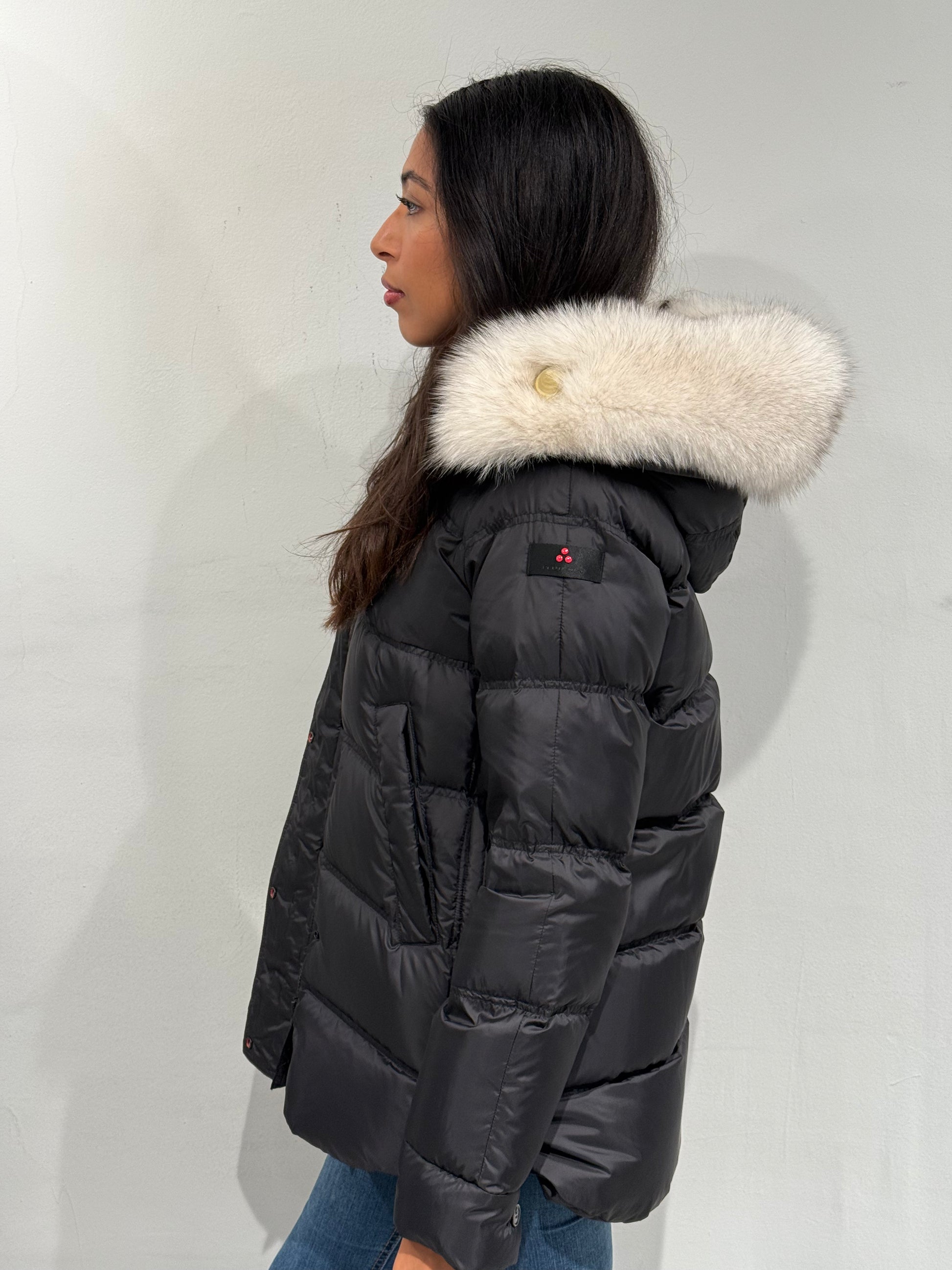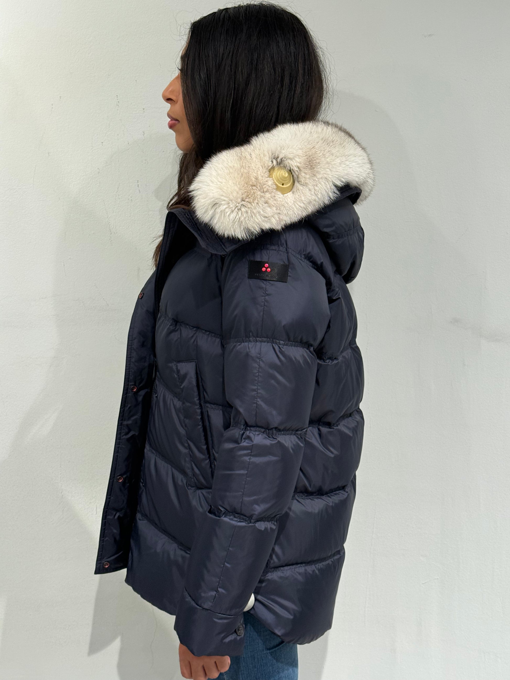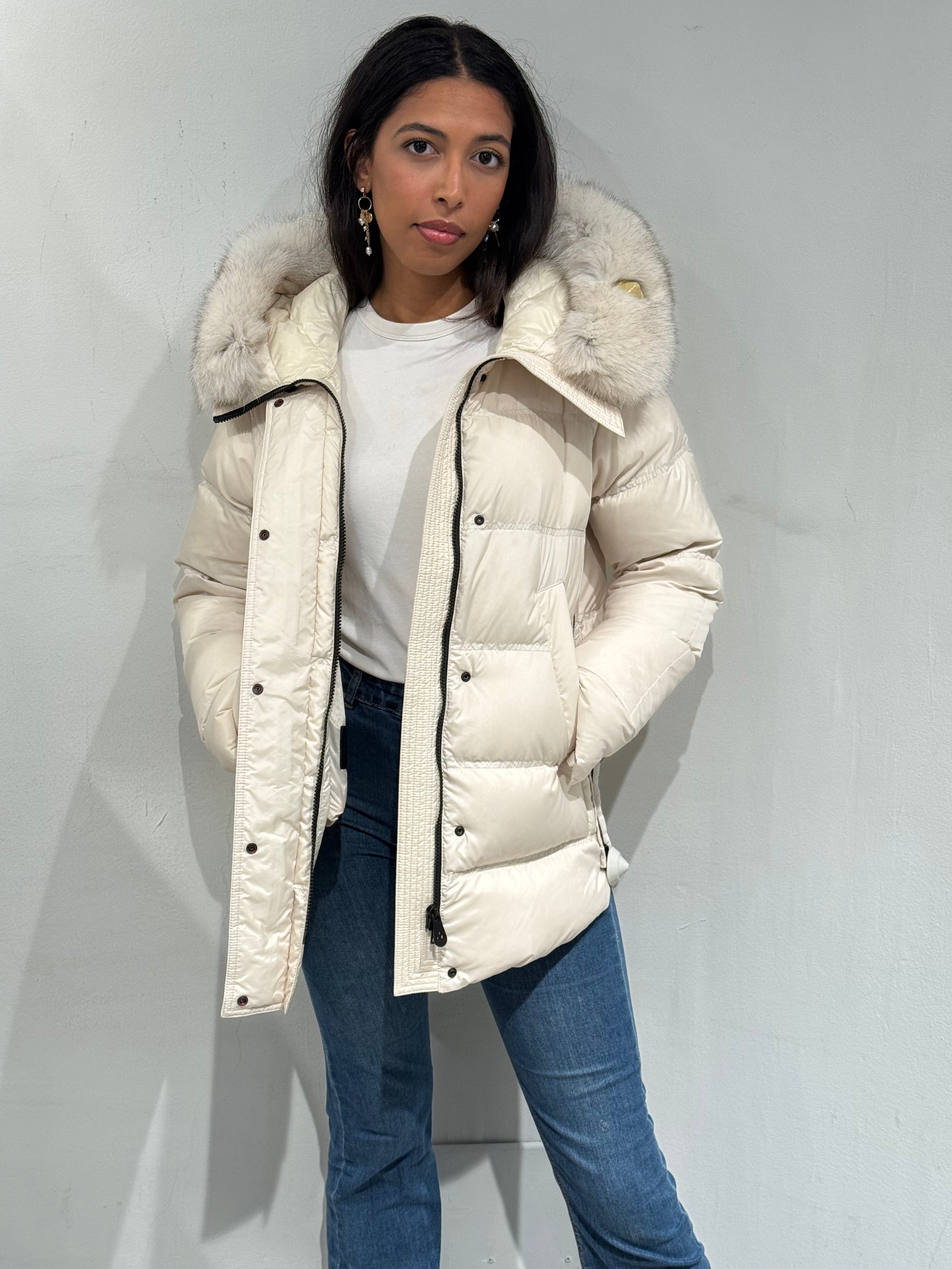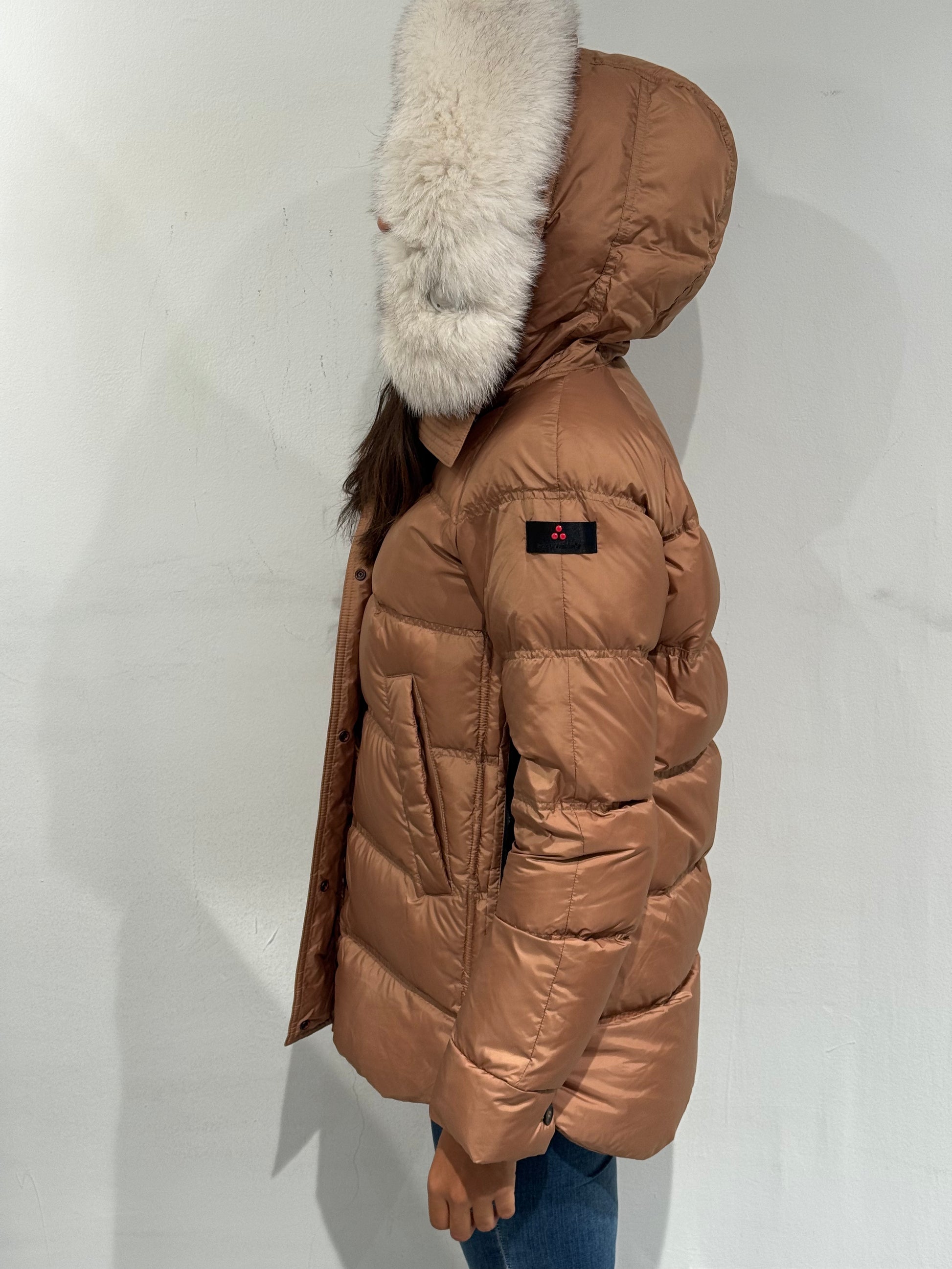 L'imbottitura in piuma naturale certificata assicur calore e comfort senza rinunciare alla leggerezza. il modello è dotto di cappuccio con bordo in pelliccia staccabile, chiusura con zip centrale coperta da patta e pratiche zip laterali per regolare la vestibilità. Un capo pratico e raffinato, pensato per accompagnarti con stile nelle giornate più fredde. Trattamento idrorepellente privo di PFC.